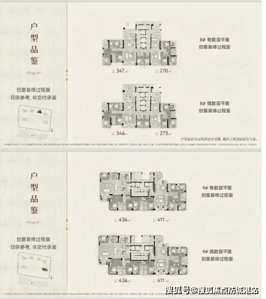4. 277-348㎡户型(6栋、8栋,3梯2户):该户型为五房两厅四卫设计,高端大平层产品,针对高端豪宅客群。客厅面宽约9米,连接全景落地窗景观阳台,江景视野极佳,可俯瞰珠江两岸繁华天际线;主卧套间设计,配备独立卫生间、步入式衣帽间、观景飘窗及私人书房,尊崇感拉满;三个次卧套间设计,配备独立卫生间,满足家人及宾客需求;还有一个次卧可作为儿童房或客房,灵活布局;厨房采用中西双厨设计,配备高端家电,操作空间充足,连接生活阳台;同时,户型配备独立玄关、储物间,实用性与私密性兼具。