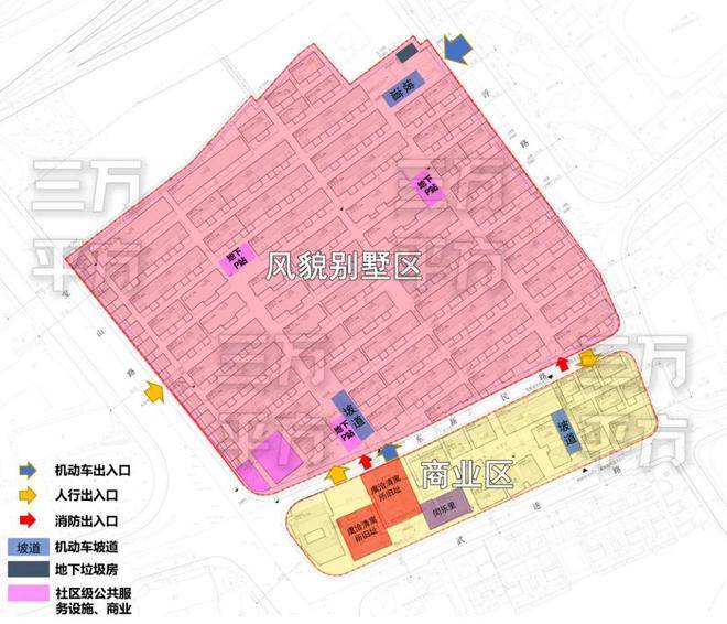 项目共有三个机动车出入口,三个人行出入口以及一个非机动车出入口。人行出入口分别面向西侧宝山路,南侧东新民路。机动车出入口分别面向东侧罗浮路,东新民路和以及南侧武进路。非机动车出入口面向东新民路。