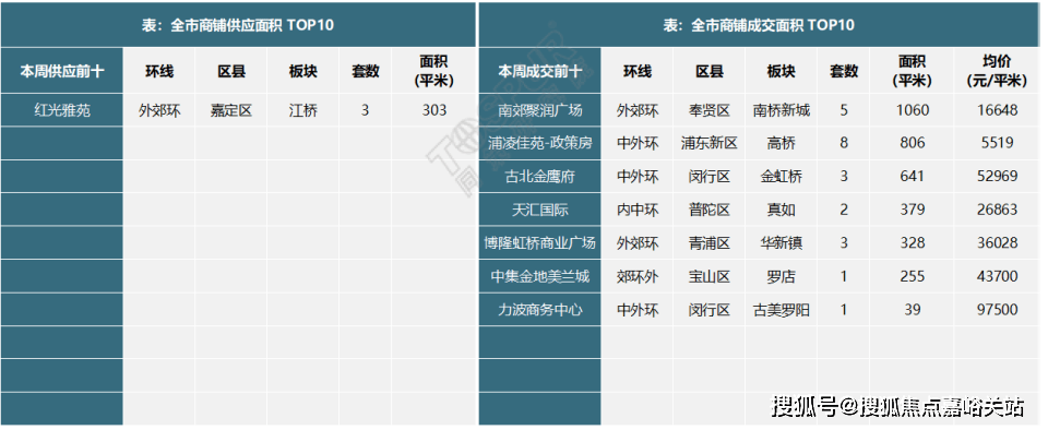 本周商业市场新增供应量0.03万平米,成交量0.35万平米,环比下跌71.30%,同比下跌56.49%,成交均价26518元/平米,环比上涨109.56%,同比上涨47.67%。本周成交主力项目是位于奉贤南桥新城板块的南郊聚润广场,项目为商办综合体,本周成交5套。