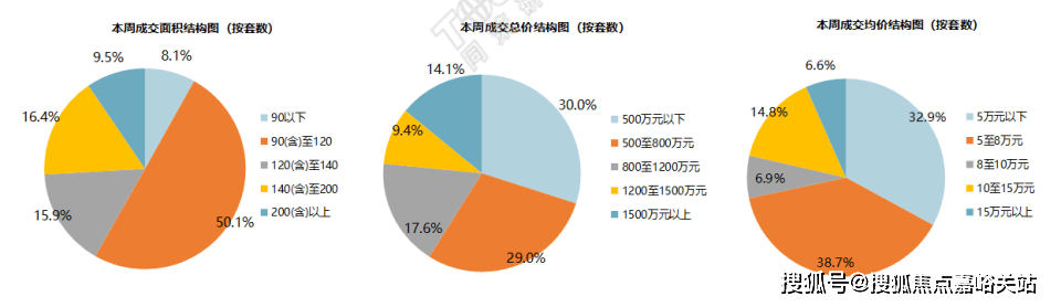 成交面积段方面:90平米以下占8.1%,较上周下降1.5个百分点;90-120平米占比50.1%,上升0.3个百分点;120-140平米占比15.9%,下降7.3个百分点;140-200平米占比16.4%,上升5.4个百分点;200平米以上占比9.5%,上升3.1个百分点。成交总价段方面:500万元以下占比30.0%,较上周下降0.5个百分点;500-800万元占比29.0%,上升6.6个百分点;800-1200万元占比17.6%,下降3.7个百分点;1200-1500万元占比9.4%,下降3.7个百分点;1500万元以上占14.1%,上升1.3个百分点。成交均价段方面:5万元以下均价段占比32.9%,较上周下降1.3百分点;5-8万元占比38.7%,上升8.4个百分点;8-10万元占比6.9%,下降3.2个百分点;10-15万元占比14.8%,下降7.2个百分点;15万元以上占比6.6%,上升3.4个百分点。
