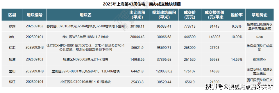 本周新增6宗土地成交,总成交金额198.8亿元。其中:溢价率最高的是保利置业摘得的杨浦宅地14.69%。总价最高的是静安商住用地,总价达到77.4亿元。中海摘得的徐汇龙华宅地,楼面价最高为148503元/平米。