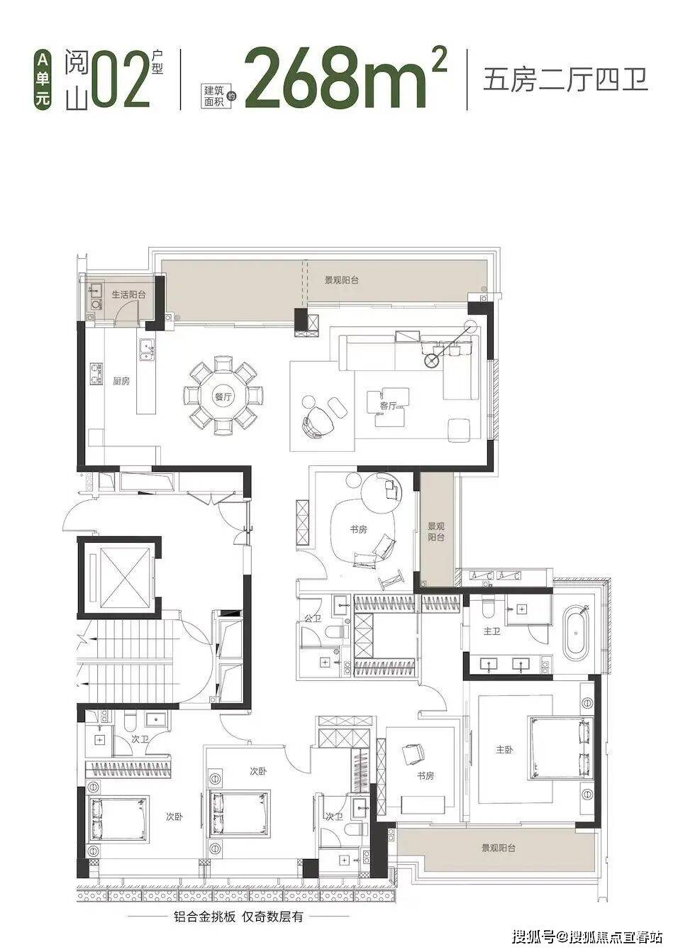 建面约268㎡五房四卫:楼王单位,总价2800-3000万。采用五房四卫三套间设计,南北四阳台、270°全景视野,约10.55米横厅,约16.1米南向大面宽。