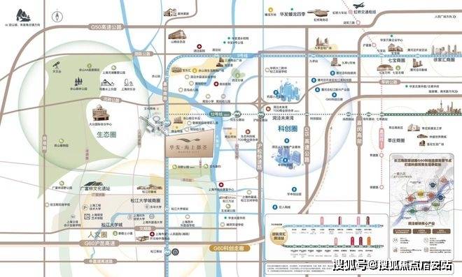 站位国际领先的可持续性项目规划,华发海上都荟结合自身的独特聚合优势,在传统TOD规划之上,不可复制的土地生态资源,向东链接G60科创走廊“以镇命名为区块”洞泾人工智能产业基地;向南直达亚洲大学城之一——松江大学城;北侧紧连上海陆面自然山林资源——佘山国家旅游度假区。板块将区域打造成为“科创+文教+生态”交汇的核心新城模式,划立一个崭新的城市单元示范。