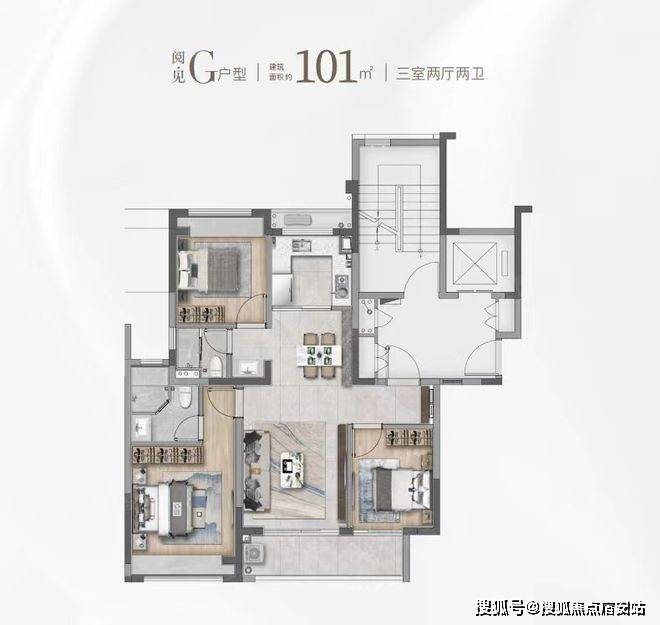 同样是3房2卫的配置,功能性与舒适度兼具。该户型惊艳的地方在于大尺度的景观边厅设计,搭配超大阳台,
