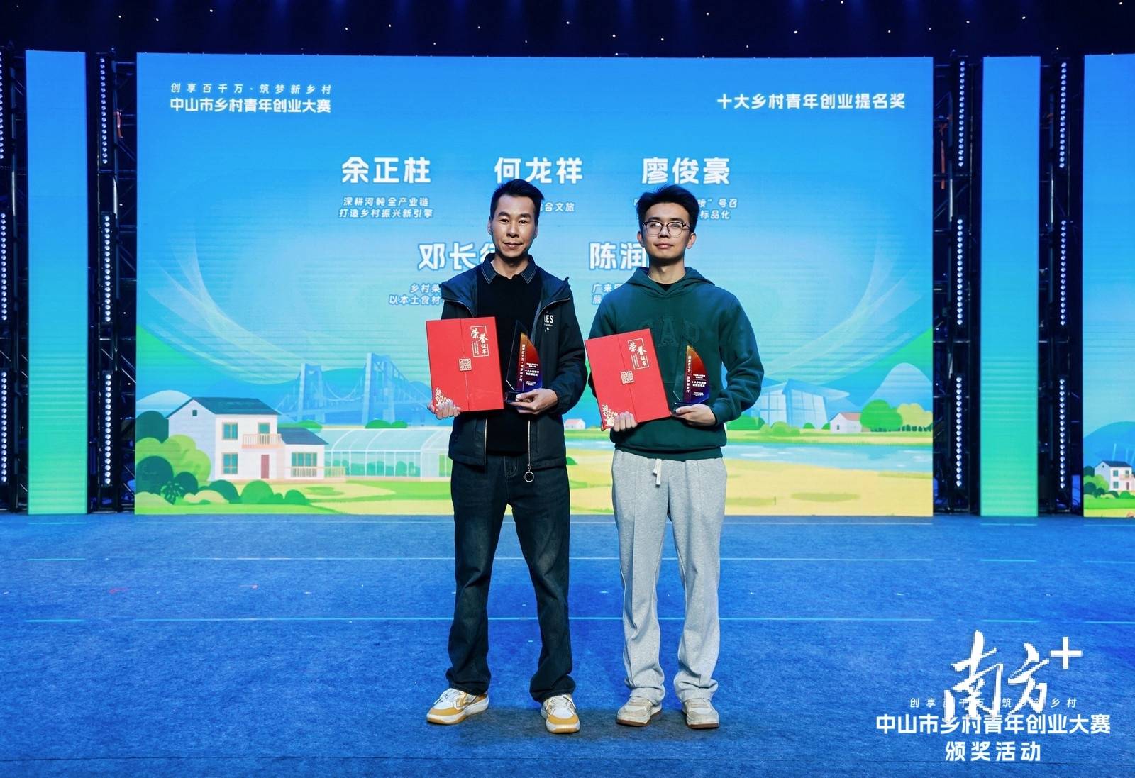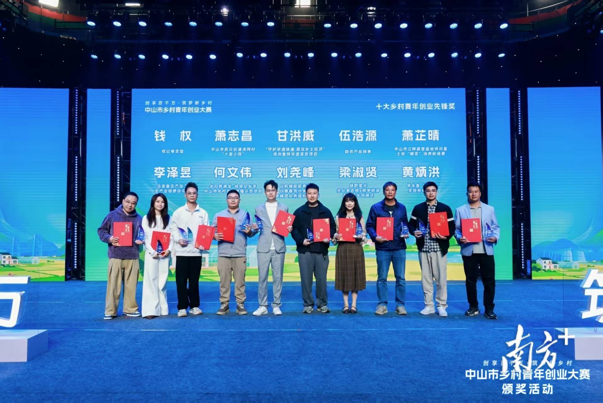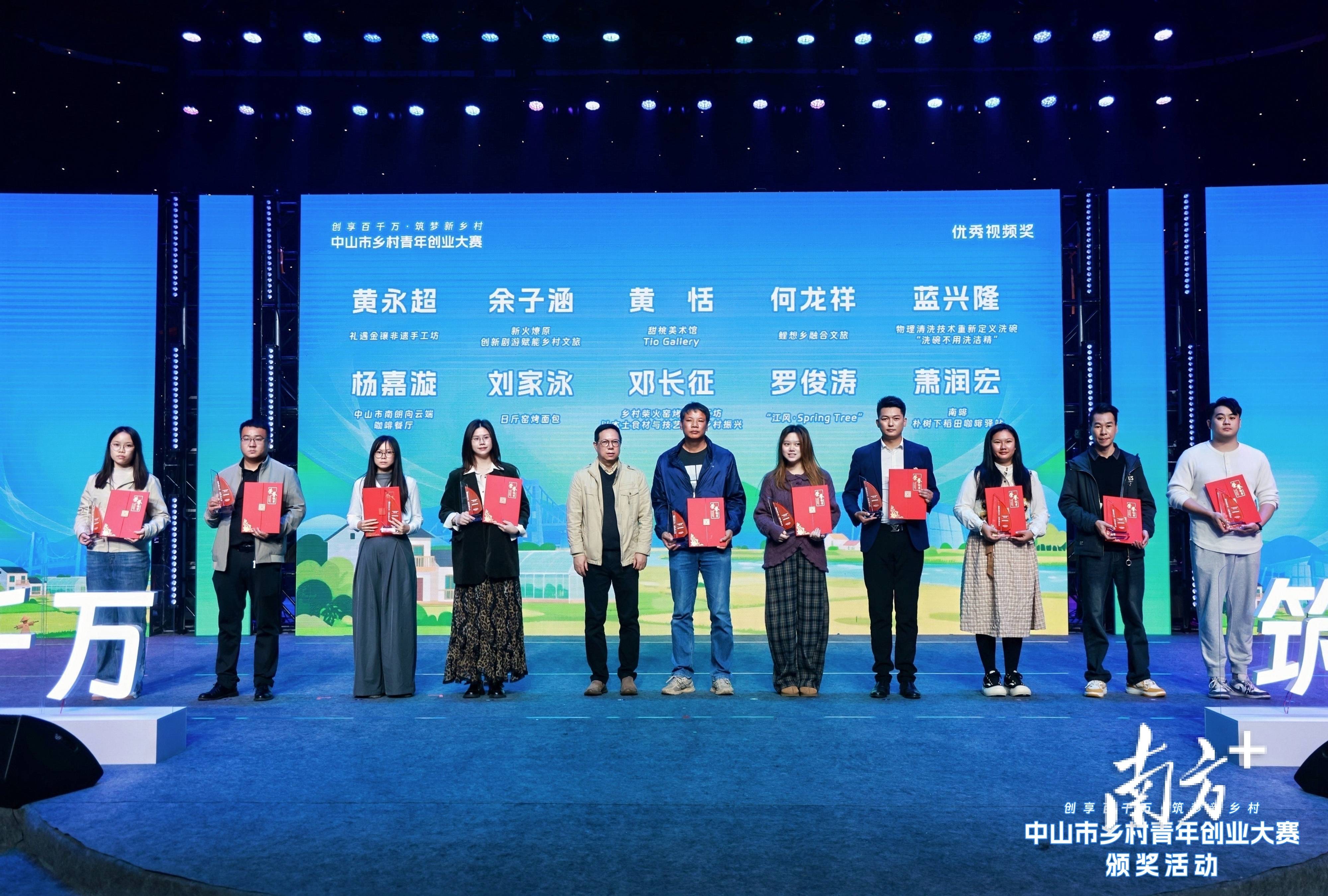 1、十大乡村青年创业先锋奖(可多选)钱权 权记粤菜馆 石岐街道萧志昌 中山市民众街道浪网村“十亩小院” 民众街道甘洪威 海洲鱼饼非遗美食项目 古镇镇伍浩源 助农产品销售 南区街道萧芷晴 中山市江畔露营基地 南区街道李泽昱 马友鱼生产加工全产业链建设项目 板芙镇何文伟 中山市乡村共富养殖示范项目 坦洲镇刘尧峰 刘尧峰团队养殖机械项目 三角梁淑贤 绿野萤光 古镇镇黄炳洪 吊水鱼“产销”全链条化经营 港口镇2、十大乡村青年创业提名奖:(可多选)余正柱 深耕河鲀全产业链 坦洲镇何龙祥 鲤想乡融合文旅 板芙镇廖俊豪 推动生鲜销售标品化 石岐街道邓长征 乡村柴火窑烤面包工坊 南区街道陈润梅 广来园林热带雨林蕨类植物创新基地 横栏镇3、优秀视频奖:(可多选)黄永超 礼遇金镶非遗手工坊 火炬开发区余子涵 新火燎原 西区街道黄恬 甜桃美术馆Tio Gallery 火炬开发区何龙祥 鲤想乡融合文旅 板芙镇蓝兴隆 “洗碗不用洗洁精” 火炬开发区杨嘉漩 中山市南朗向云端咖啡餐厅 南朗街道刘家泳 日斤窑烤面包 东凤镇邓长征 乡村柴火窑烤面包工坊 南区街道罗俊涛 “江风·Spring Tree” 南头镇萧润宏 南啡 大涌镇4、网络人气奖:(可多选)钱权 权记粤菜馆 石岐街道廖俊豪 推动生鲜销售标品化 石岐街道萧志昌 中山市民众街道浪网村“十亩小院” 民众街道萧芷晴 中山市江畔露营基地 南区街道袁嘉骏 无人机聚力乡村发展 石岐街道甘洪威 海洲鱼饼非遗美食项目 古镇镇李思稹 “璞卓”心理疗愈旅行文化项目 东区街道黄炳洪 吊水鱼“产销”全链条化经营 港口镇麦键浈 西区石龙树木公园 小榄镇谭婉君 乡野咖香 东凤镇5、优秀组织奖:(可多选)五桂山街道南区街道大涌镇板芙镇古镇镇坦洲镇东凤镇火炬开发区石岐街道南头镇提交