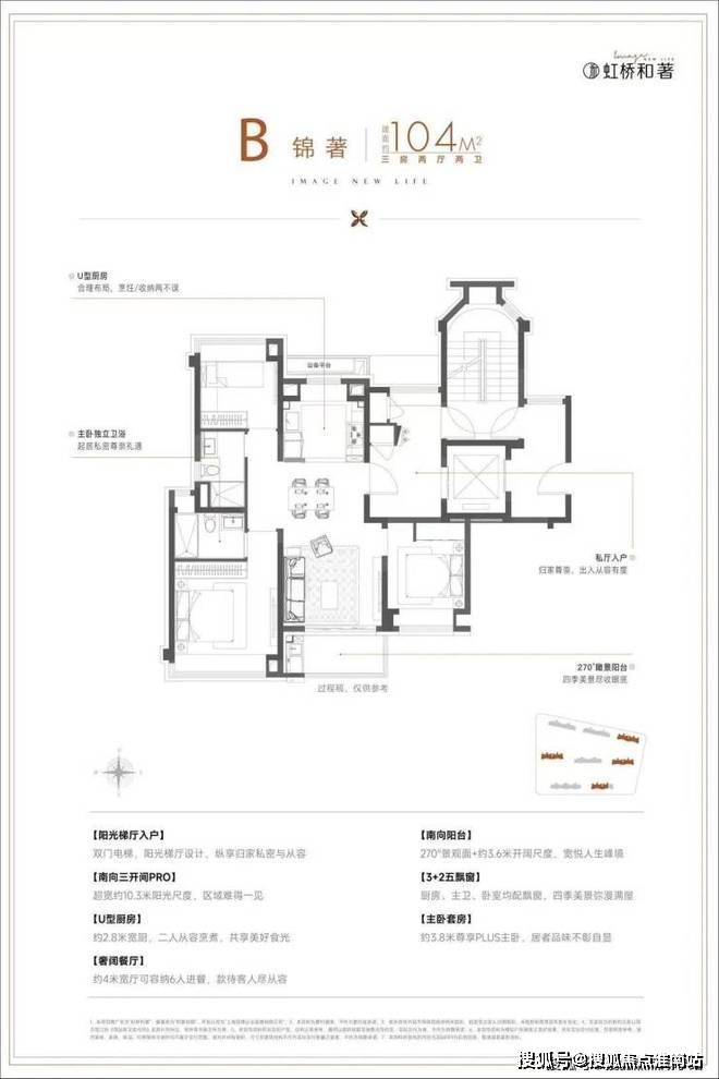 建面约104㎡3房,在建面94㎡小3房优点上,又进一步升级了尺度感,约10.3m的南向面宽,为室内带来了出众的采光面和尺度感,这个户型无论从实用性、尺度感,亦或是视野、采光、私密性来说,都做得相当优秀。