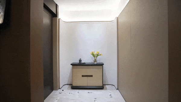 而且这个空间的装标也是非常精致的,1.7米双扇铸铝门,搭配宝格丽石材与祥云灰拼花,延伸至电梯厅。皇家白玉石玄关,兼具储物与展示功能,质感温润。